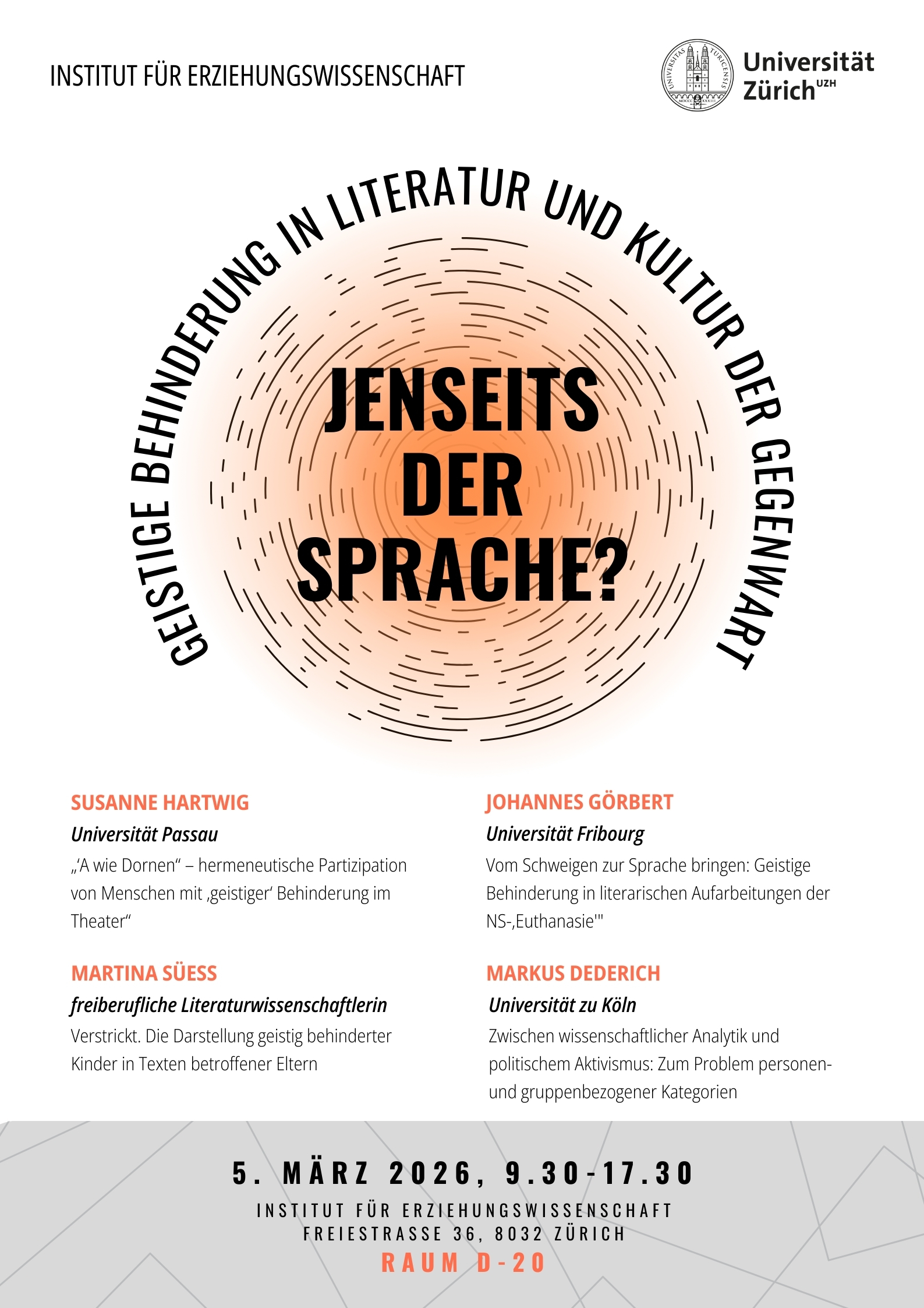 Unser besonderes Interesse gilt der Kategorie Behinderung – sowohl in ihrer aktuellen als auch in ihrer historischen Dimension. Methodologisch konzentrieren wir uns auf bildungstheoretische, wissensgeschichtliche und ethisch-normative Forschungszugänge. In der empirischen Forschung liegt unser hauptsächlicher Forschungsschwerpunkt im ausserschulischen Bereich.